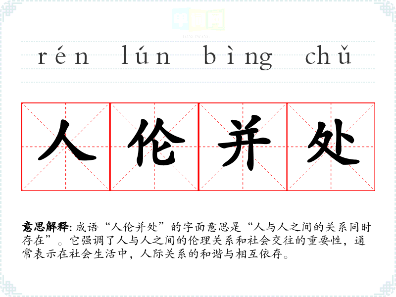 成语“人伦并处”的字面意思是“人与人之间的关系同时存在”。它强调了人与人之间的伦理关系和社会交往的重要性,通常表示在社会生活中,人际关系的和谐与相互依存。
