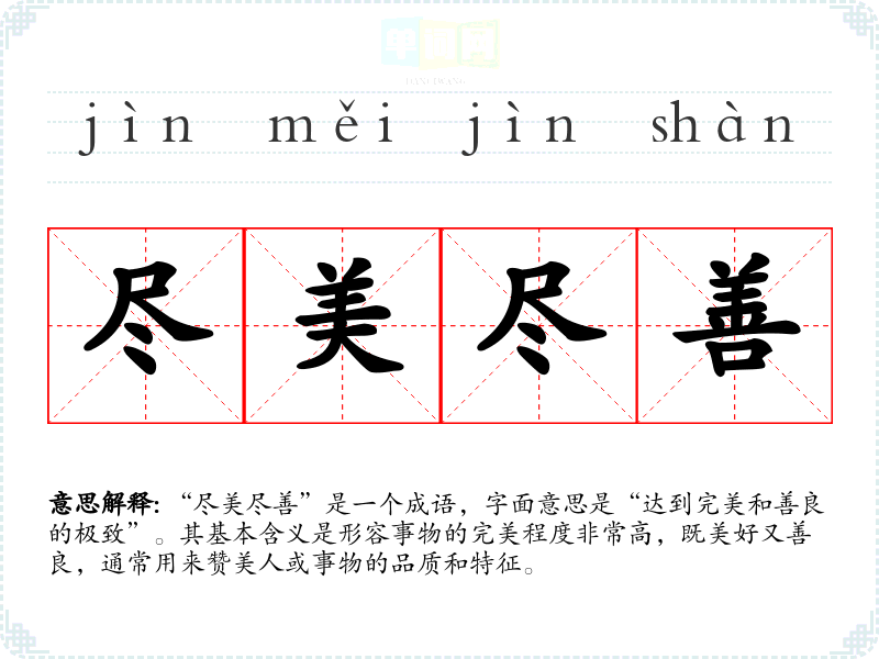 | 尽善尽美 | 极其完善,极其美好。指完美到没有一点缺点。 |