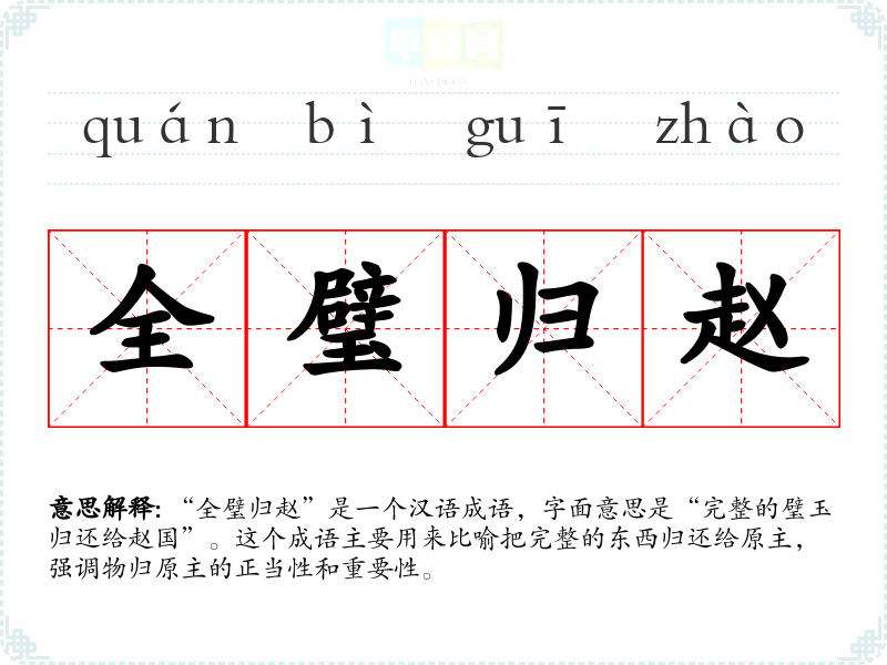 | 全璧归赵 | 本指蔺相如将和氏璧完好地自秦送回赵国。后比喻把原物完好地归还本人。同“完璧归赵”。 |