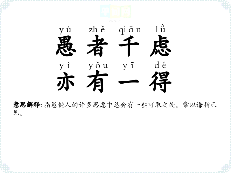 | 千虑一得 | 即使愚笨的人,在很多次考虑中也总会有些可取的地方。多用来表示自谦。 |