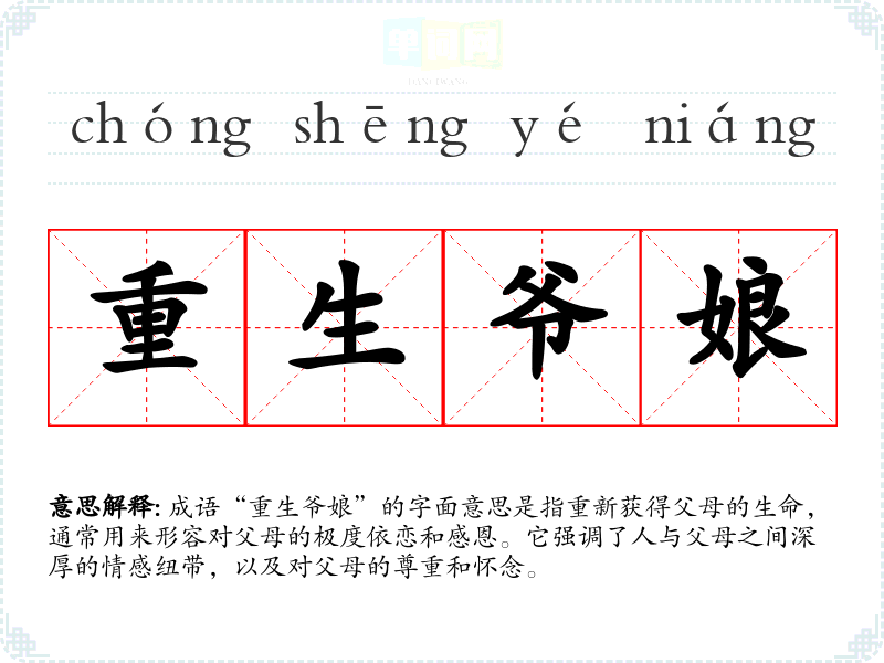 成语“重生爷娘”的字面意思是指重新获得父母的生命,通常用来形容对父母的极度依恋和感恩。它强调了人与父母之间深厚的情感纽带,以及对父母的尊重和怀念。