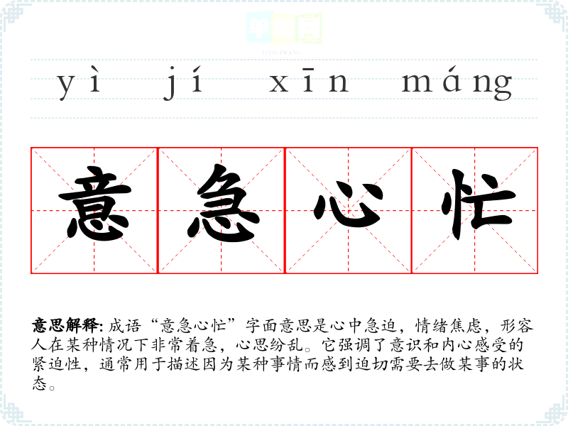 成语“意急心忙”字面意思是心中急迫,情绪焦虑,形容人在某种情况下非常着急,心思纷乱。它强调了意识和内心感受的紧迫性,通常用于描述因为某种事情而感到迫切需要去做某事的状态。