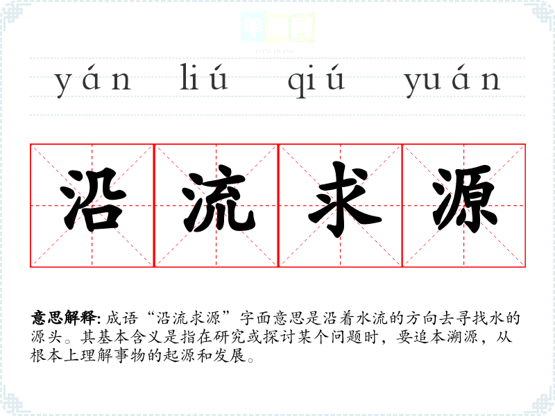 成语“沿流求源”字面意思是沿着水流的方向去寻找水的源头。其基本含义是指在研究或探讨某个问题时,要追本溯源,从根本上理解事物的起源和发展。
