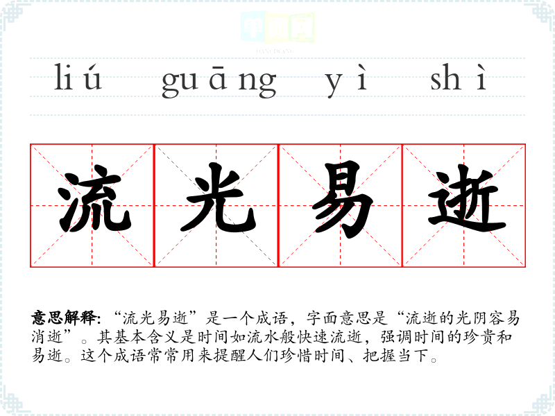 “流光易逝”出自古代诗词,尤其是与时间、生命相关的文学作品中。虽然该成语的具体出处较难追溯,但它与许多古代诗人的感慨相呼应,如李白、杜甫等人在诗中常常表达对时间流逝的感伤。反映了古人重视时间、生命短暂的哲学思考。