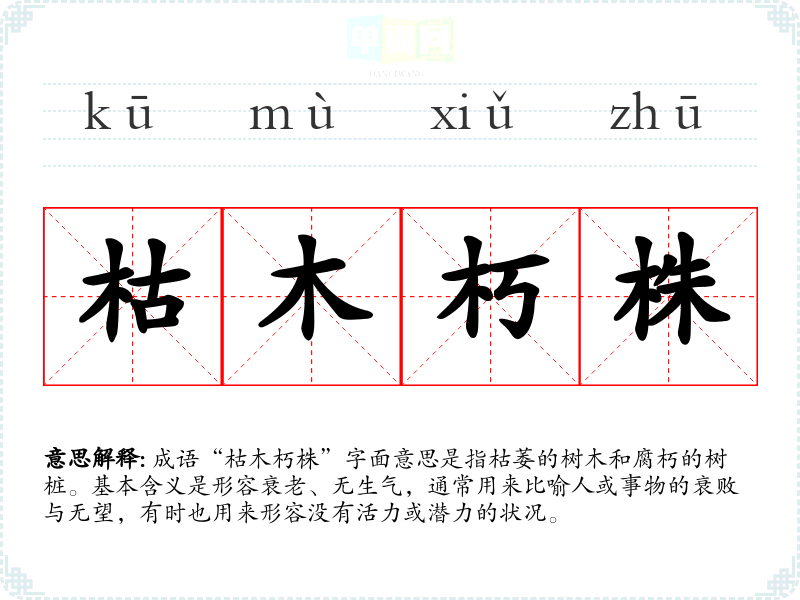 成语“枯木朽株”字面意思是指枯萎的树木和腐朽的树桩。基本含义是形容衰老、无生气,通常用来比喻人或事物的衰败与无望,有时也用来形容没有活力或潜力的状况。