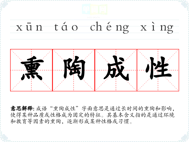 “熏陶成性”来源于古代的道德教育观念,强调环境、教育对个体性格形成的重要性。虽然在历史文献中没有明确的出处,但类似的表达常见于儒家思想中,强调“德行”的培养和环境的影响。