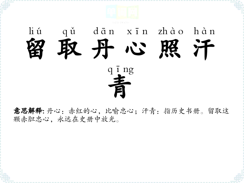 | 留取丹心照汗青 | 丹心:赤红的心,比喻忠心;汗青:指历史书册。留取这颗赤胆忠心,永远在史册中放光。 |