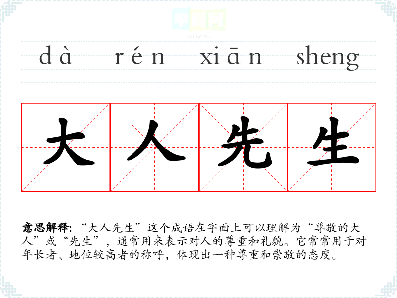 “大人先生”这个成语在字面上可以理解为“尊敬的大人”或“先生”,通常用来表示对人的尊重和礼貌。它常常用于对年**、地位较高者的称呼,体现出一种尊重和崇敬的态度。