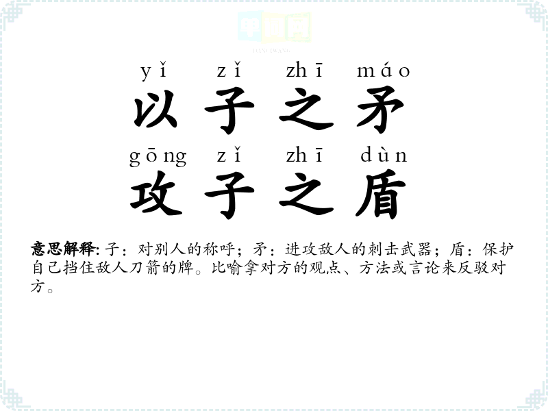 | 以子之矛,攻子之盾 | 子:对别人的称呼;矛:进攻敌人的刺击武器;盾:保护自己挡住敌人刀箭的牌。比喻拿对方的观点、方法或言论来反驳对方。 |