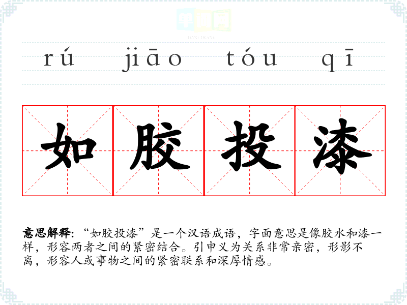 “如胶投漆”是一个汉语成语,字面意思是像胶水和漆一样,形容两者之间的紧密结合。引申义为关系非常亲密,形影不离,形容人或事物之间的紧密联系和深厚情感。