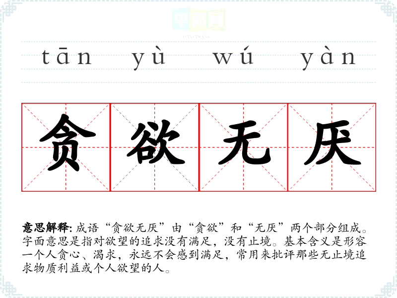 成语“贪欲无厌”由“贪欲”和“无厌”两个部分组成。字面意思是指对欲望的追求没有满足,没有止境。基本含义是形容一个人贪心、渴求,永远不会感到满足,常用来批评那些无止境追求物质利益或个人欲望的人。