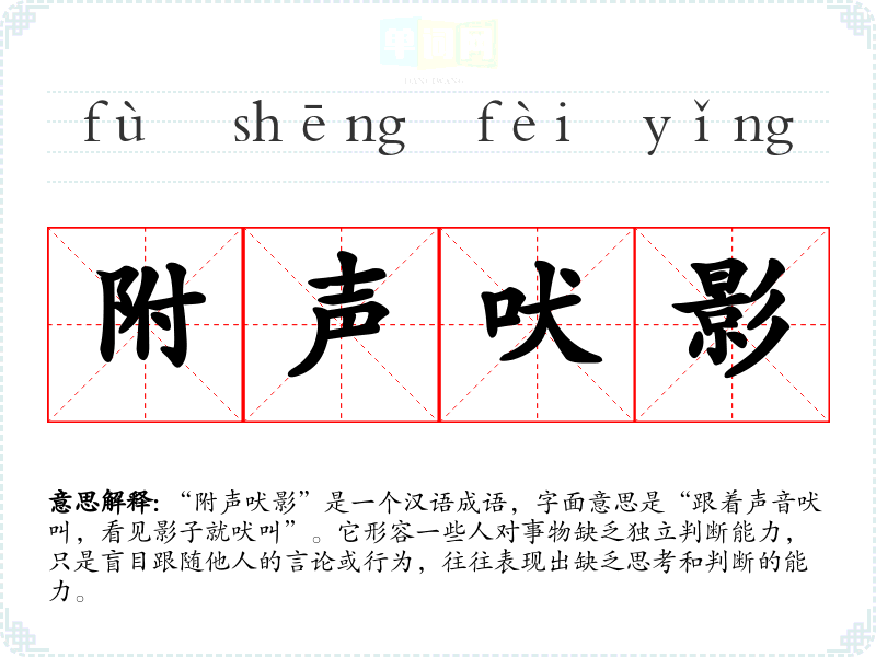 “附声吠影”是一个汉语成语,字面意思是“跟着声音吠叫,看见影子就吠叫”。它形容一些人对事物缺乏独立判断能力,只是盲目跟随他人的言论或行为,往往表现出缺乏思考和判断的能力。