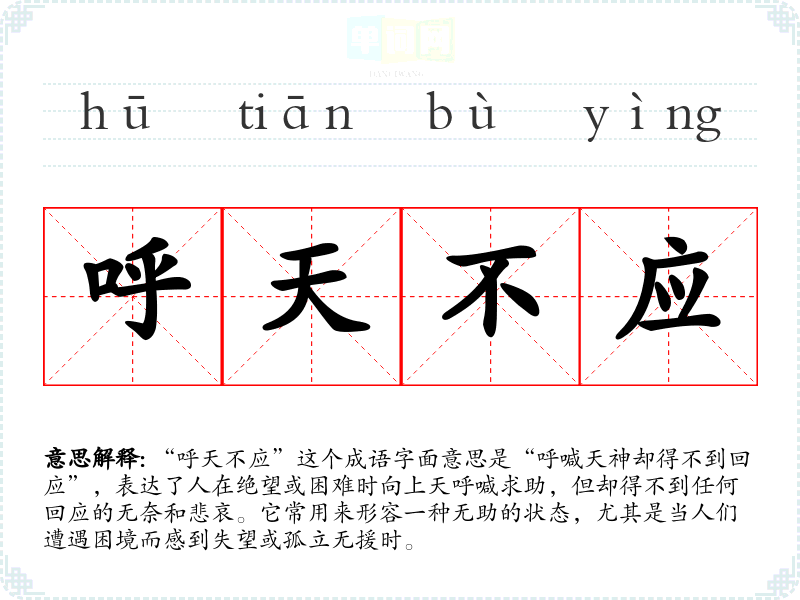 “呼天不应”这个成语字面意思是“呼喊天神却得不到回应”,表达了人在绝望或困难时向上天呼喊求助,但却得不到任何回应的无奈和悲哀。它常用来形容一种无助的状态,尤其是当人们遭遇困境而感到失望或孤立无援时。