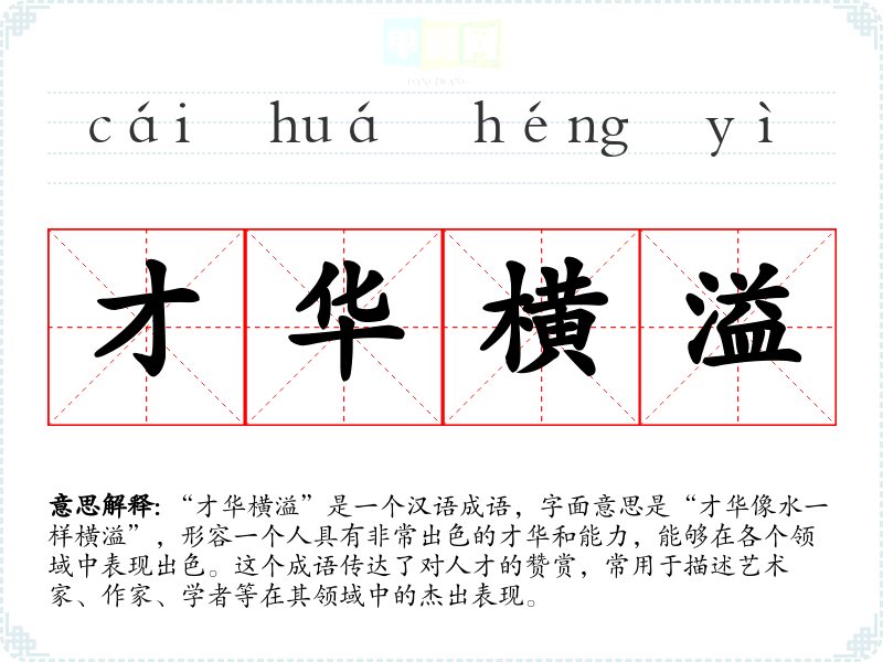 “才华横溢”是一个汉语成语,字面意思是“才华像水一样横溢”,形容一个人具有非常出色的才华和能力,能够在各个领域中表现出色。这个成语传达了对人才的赞赏,常用于描述艺术家、作家、学者等在其领域中的杰出表现。
