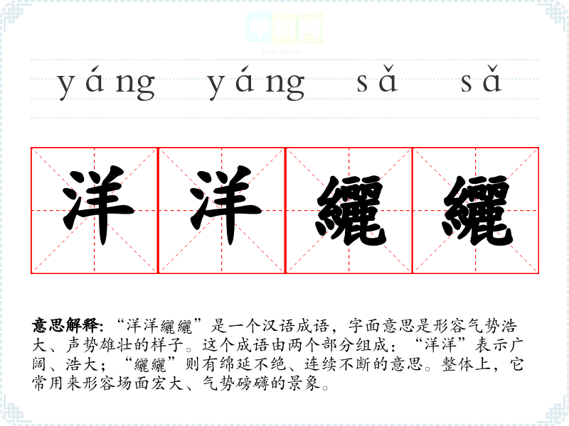 在传统文化中,成语常用来表达对自然、历史和社会的理解与感悟。“洋洋纚纚”所体现的浩大气势,常常与古代诗词中对自然景观的描绘相结合,反映出人们对宇宙和生命的敬畏。在现代社会,这个成语可以用在各种场合,尤其是那些需要强调气氛和场面的场合。