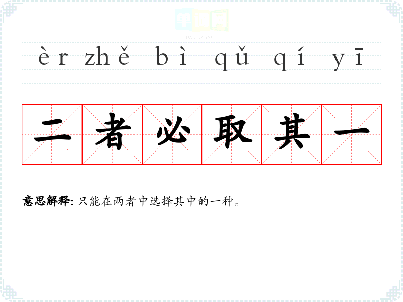 | 二者必居其一 | 居:占。只能在两者中选择其中的一种。 |