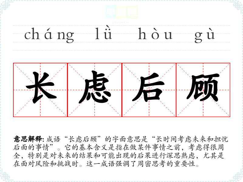 成语“长虑后顾”的字面意思是“长时间考虑未来和担忧后面的事情”。它的基本含义是指在做某件事情之前,考虑得很周全,特别是对未来的结果和可能出现的后果进行深思熟虑,尤其是在面对风险和挑战时。这一成语强调了周密思考的重要性。