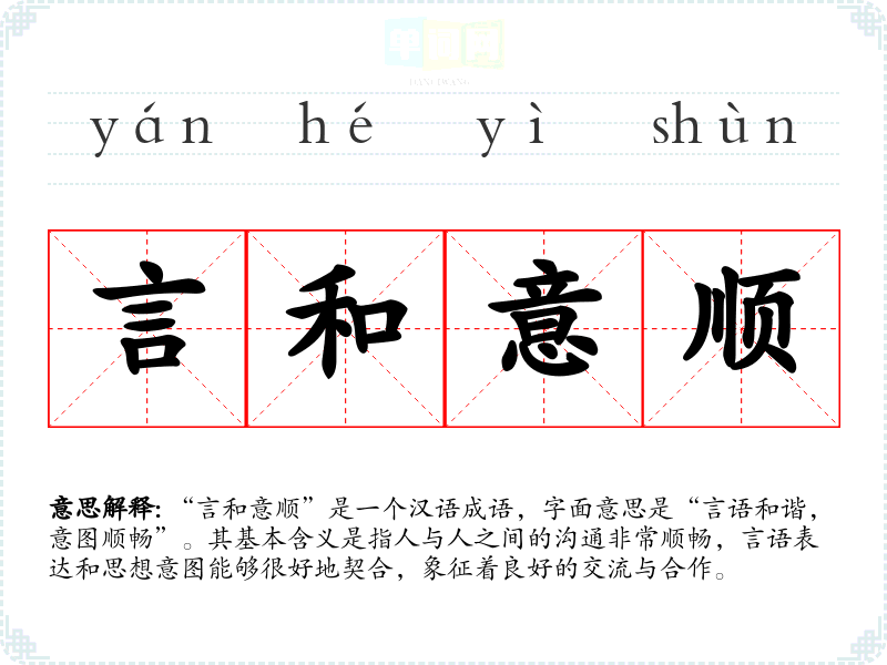 “言和意顺”是一个汉语成语,字面意思是“言语和谐,意图顺畅”。其基本含义是指人与人之间的沟通非常顺畅,言语表达和思想意图能够很好地契合,象征着良好的交流与合作。