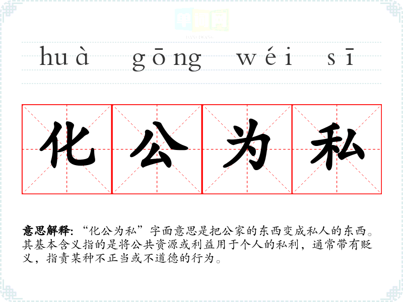 “化公为私”字面意思是把公家的东西变成私人的东西。其基本含义指的是将公共资源或利益用于个人的私利,通常带有贬义,指责某种不正当或不道德的行为。