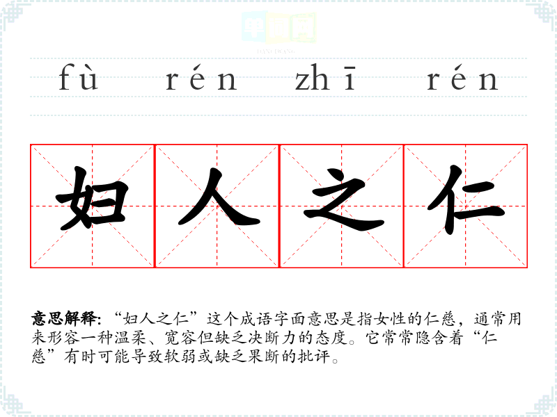 “妇人之仁”这个成语字面意思是指女性的仁慈,通常用来形容一种温柔、宽容但缺乏决断力的态度。它常常隐含着“仁慈”有时可能导致软弱或缺乏果断的批评。