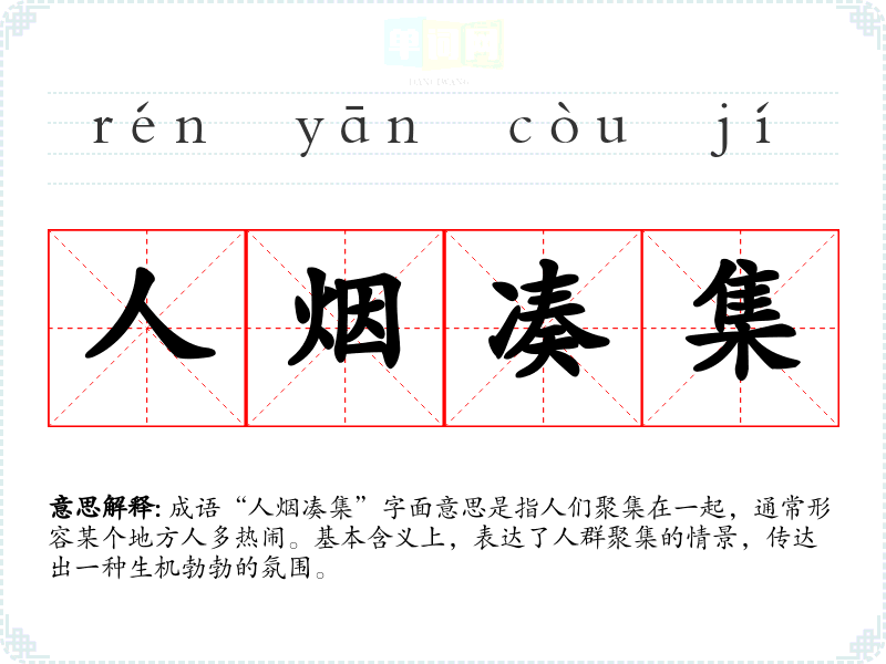 成语“人烟凑集”字面意思是指人们聚集在一起,通常形容某个地方人多热闹。基本含义上,表达了人群聚集的情景,传达出一种生机勃勃的氛围。