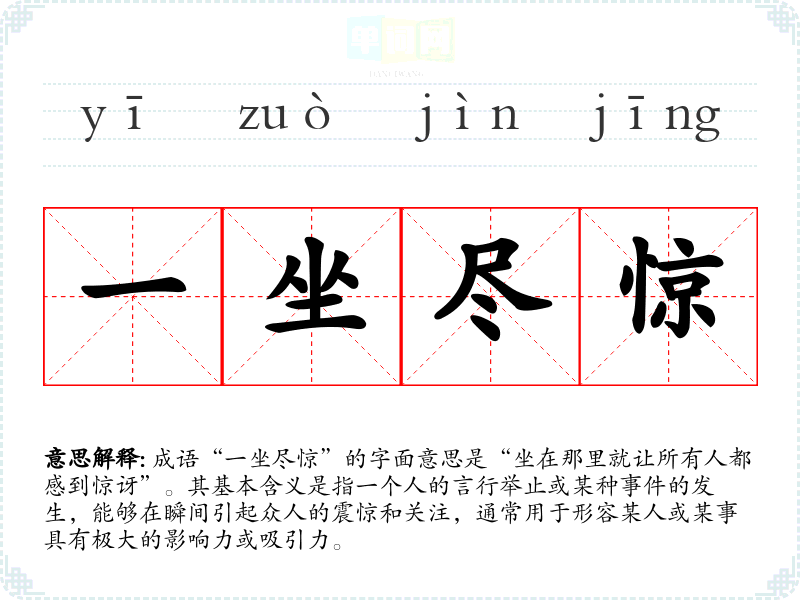 成语“一坐尽惊”的字面意思是“坐在那里就让所有人都感到惊讶”。其基本含义是指一个人的言行举止或某种**的发生,能够在瞬间引起众人的震惊和关注,通常用于形容某人或某事具有极大的影响力或吸引力。