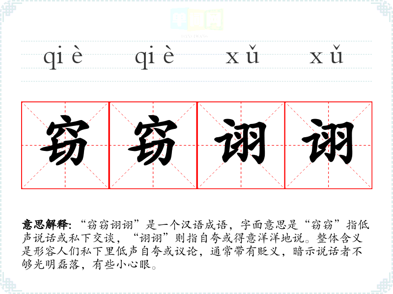 “窃窃诩诩”是一个汉语成语,字面意思是“窃窃”指低声说话或私下交谈,“诩诩”则指自夸或得意洋洋地说。整体含义是形容人们私下里低声自夸或议论,通常带有贬义,暗示说话者不够光明磊落,有些小心眼。