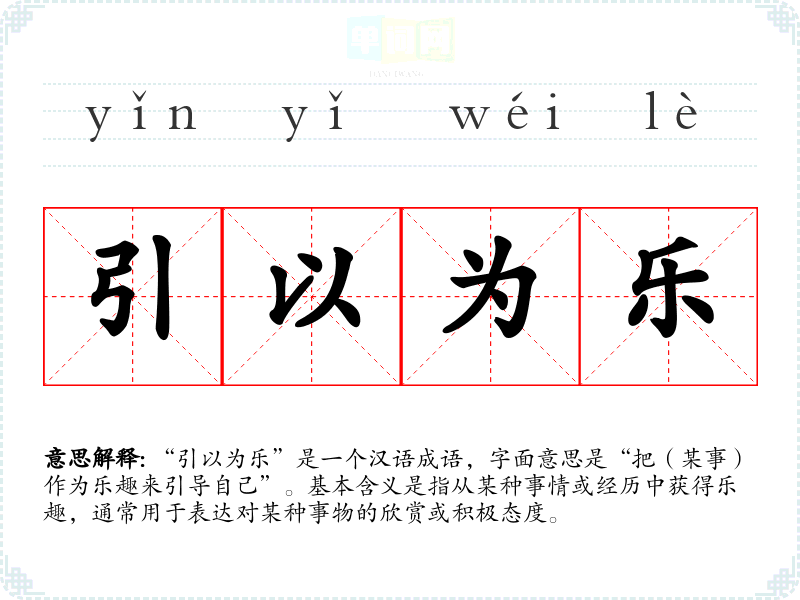 “引以为乐”是一个汉语成语,字面意思是“把(某事)作为乐趣来引导自己”。基本含义是指从某种事情或经历中获得乐趣,通常用于表达对某种事物的欣赏或积极态度。