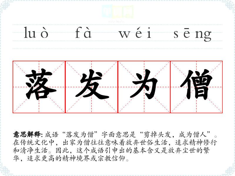 成语“落发为僧”字面意思是“剪掉头发,成为僧人”。在传统文化中,出家为僧往往意味着放弃世俗生活,追求精神修行和清净生活。因此,这个成语引申出的基本含义是放弃尘世的繁华,追求更高的精神境界或**信仰。