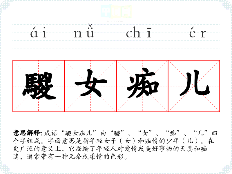 成语“騣女痴儿”由“騣”、“女”、“痴”、“儿”四个字组成。字面意思是指年轻女子(女)和痴情的少年(儿)。在更广泛的意义上,它描绘了年轻人对爱情或美好事物的天真和痴迷,通常带有一种无奈或柔情的色彩。