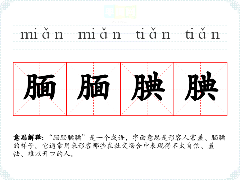 “腼腼腆腆”是一个成语,字面意思是形容人害羞、腼腆的样子。它通常用来形容那些在社交场合中表现得不太自信、羞怯、难以开口的人。