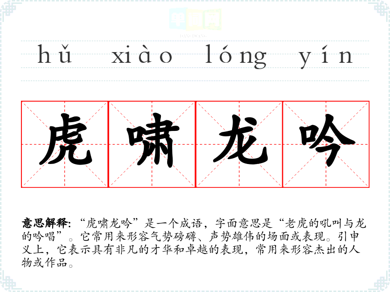 “虎啸龙吟”是一个成语,字面意思是“**的吼叫与龙的吟唱”。它常用来形容气势磅礴、声势雄伟的场面或表现。引申义上,它表示具有非凡的才华和卓越的表现,常用来形容杰出的人物或作品。