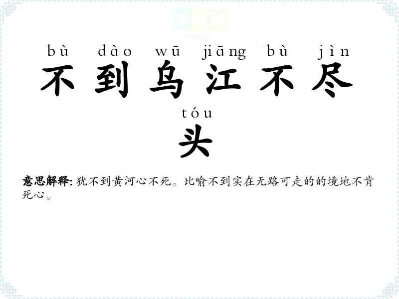 | 不到乌江不肯休 | 犹不到黄河心不死。同“不到乌江不尽头”。 |