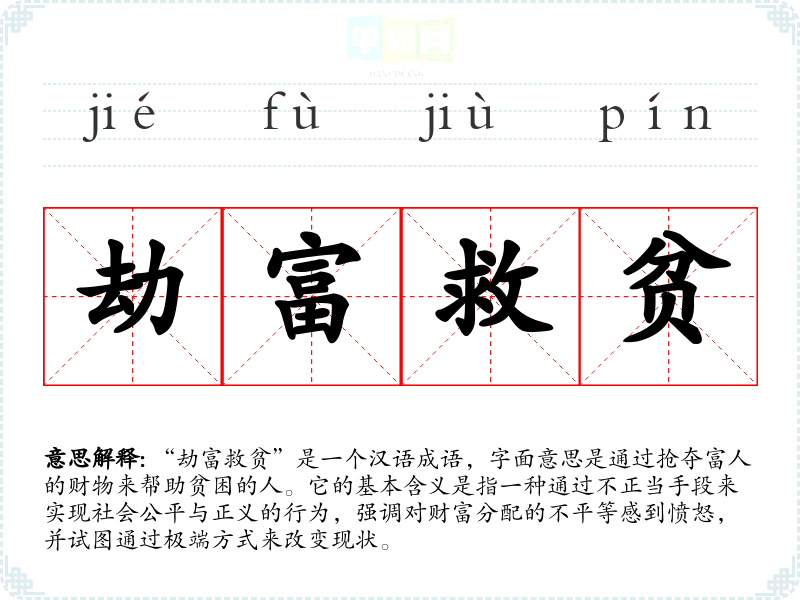 “劫富救贫”是一个汉语成语,字面意思是通过抢夺富人的财物来帮助贫困的人。它的基本含义是指一种通过不正当手段来实现社会公平与正义的行为,强调对财富分配的不平等感到愤怒,并试图通过极端方式来改变现状。