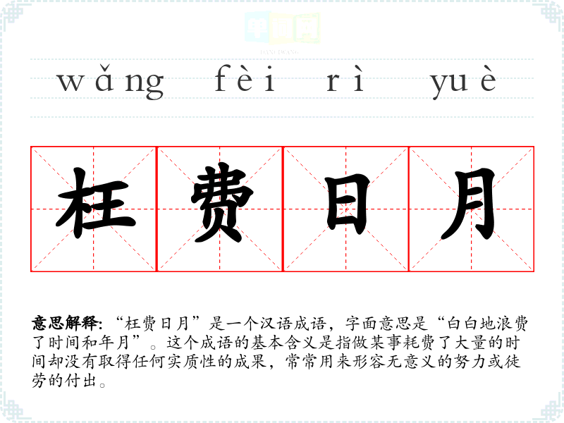 “枉费日月”是一个汉语成语,字面意思是“白白地浪费了时间和年月”。这个成语的基本含义是指做某事耗费了大量的时间却没有取得任何实质性的成果,常常用来形容无意义的努力或徒劳的付出。