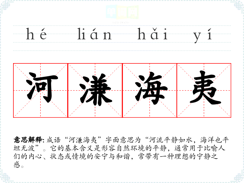 成语“河溓海夷”字面意思为“河流平静如水,海洋也平坦无波”。它的基本含义是形容自然环境的平静,通常用于比喻人们的内心、状态或情境的安宁与和谐,常带有一种理想的宁静之感。