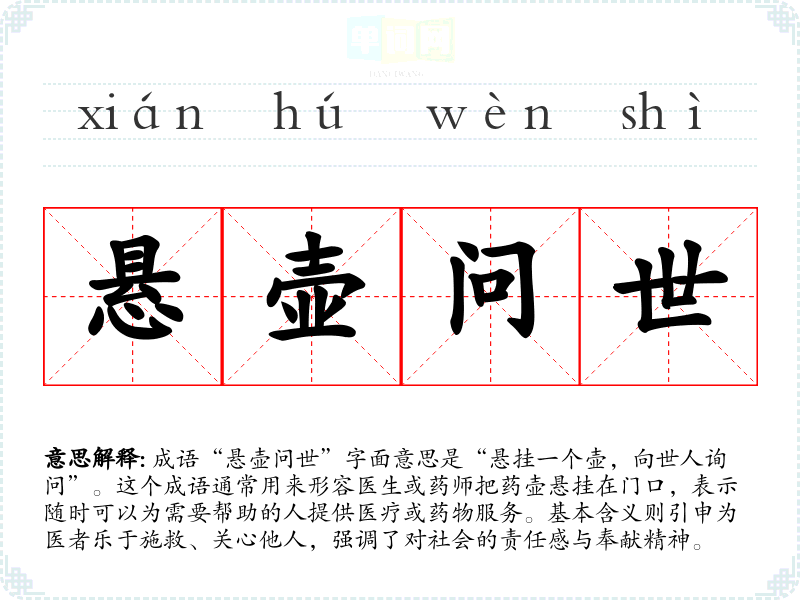 成语“悬壶问世”字面意思是“悬挂一个壶,向世人询问”。这个成语通常用来形容医生或药师把药壶悬挂在门口,表示随时可以为需要帮助的人提供医疗或药物服务。基本含义则引申为医者乐于施救、关心他人,强调了对社会的责任感与奉献精神。