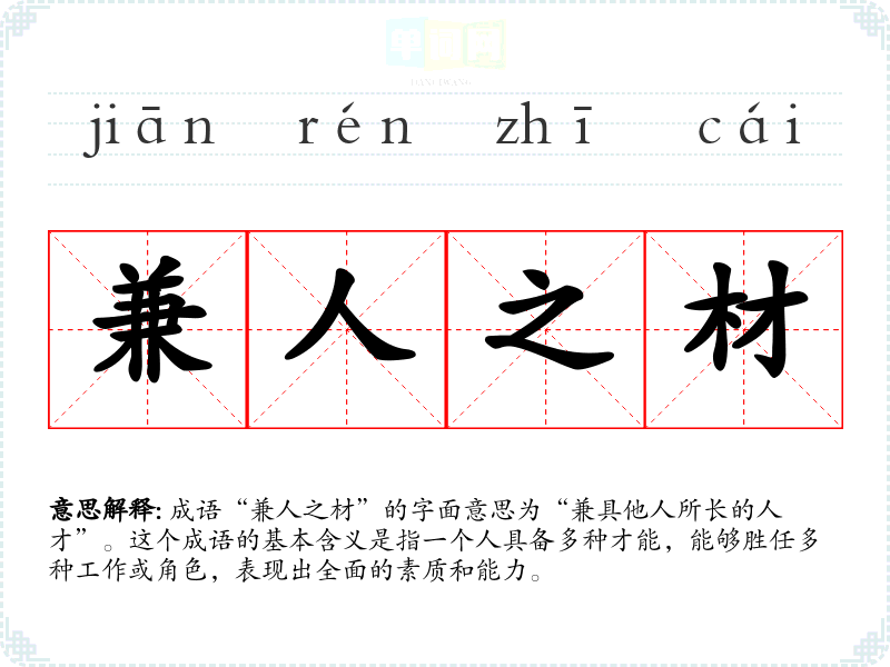 成语“兼人之材”的字面意思为“兼具他人所长的人才”。这个成语的基本含义是指一个人具备多种才能,能够胜任多种工作或角色,表现出全面的素质和能力。