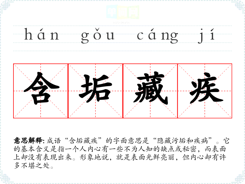 成语“含垢藏疾”的字面意思是“隐藏污垢和疾病”。它的基本含义是指一个人内心有一些不为人知的缺点或秘密,而表面上却没有表现出来。形象地说,就是表面光鲜亮丽,但内心却有许多不堪之处。