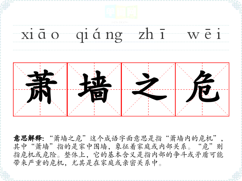“萧墙之危”这个成语字面意思是指“萧墙内的危机”,其中“萧墙”指的是家中围墙,象征着家庭或内部关系。“危”则指危机或危险。整体上,它的基本含义是指内部的争斗或矛盾可能带来严重的危机,尤其是在家庭或亲密关系中。