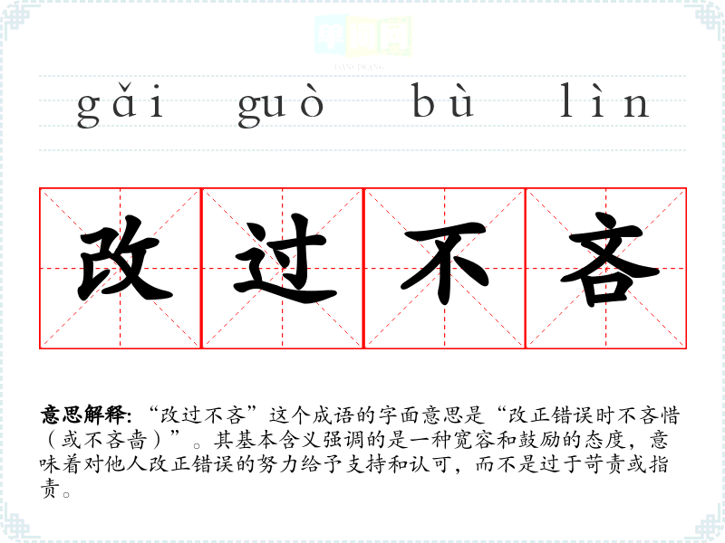 “改过不吝”这个成语的字面意思是“改正错误时不吝惜(或不吝啬)”。其基本含义强调的是一种宽容和鼓励的态度,意味着对他人改正错误的努力给予支持和认可,而不是过于苛责或指责。