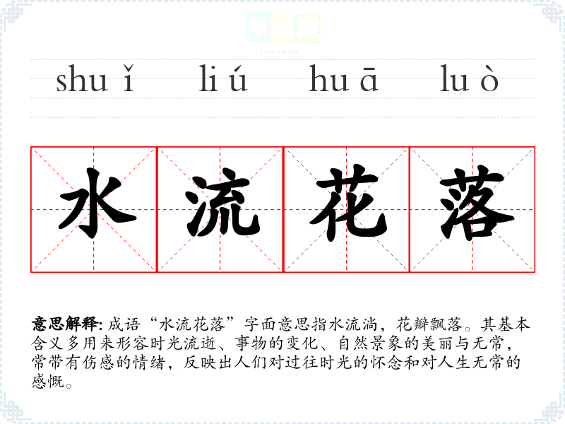成语“水流花落”字面意思指水流淌,花瓣飘落。其基本含义多用来形容时光流逝、事物的变化、自然景象的美丽与无常,常带有伤感的情绪,反映出人们对过往时光的怀念和对人生无常的感慨。