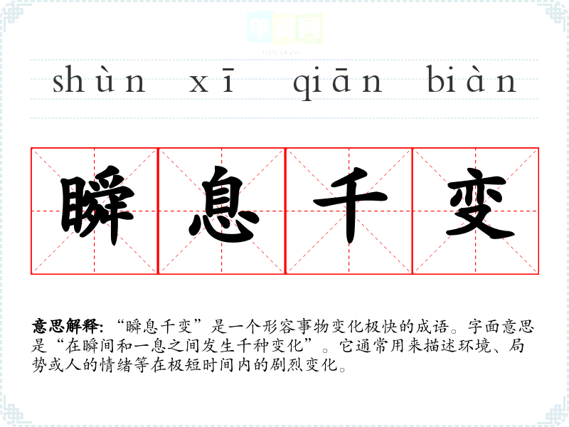 “瞬息千变”并没有明确的历史典故或文学出处,但其构造上可以看出它源于对时间和变化的深刻理解。在古代文学中,许多作品都描写了瞬息万变的事物,反映了对人生无常和变幻莫测的哲学思考。