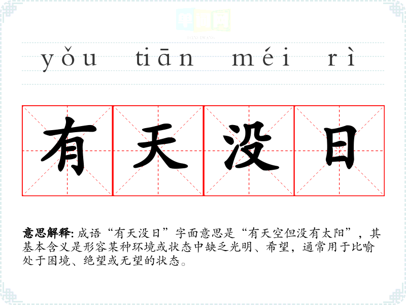 成语“有天没日”字面意思是“有天空但没有太阳”,其基本含义是形容某种环境或状态中缺乏光明、希望,通常用于比喻处于困境、绝望或无望的状态。