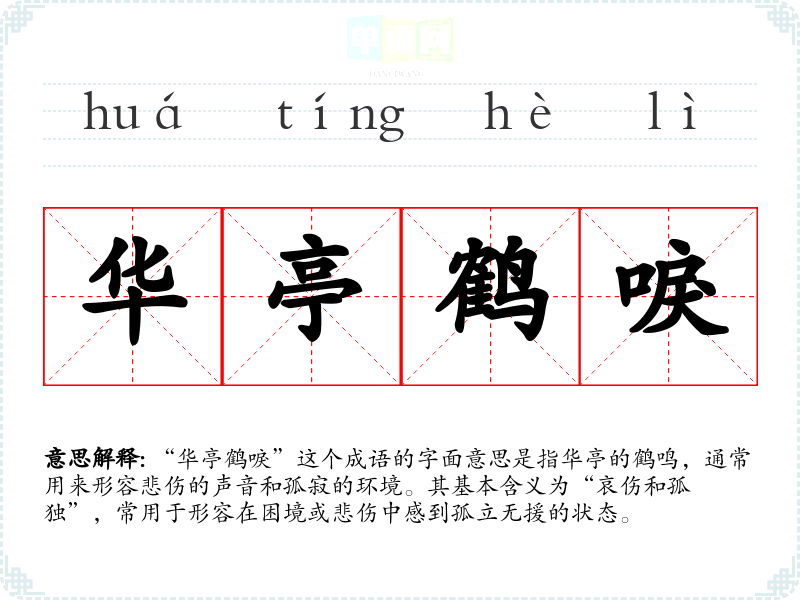 “华亭鹤唳”这个成语的字面意思是指华亭的鹤鸣,通常用来形容悲伤的声音和孤寂的环境。其基本含义为“哀伤和孤独”,常用于形容在困境或悲伤中感到孤立无援的状态。