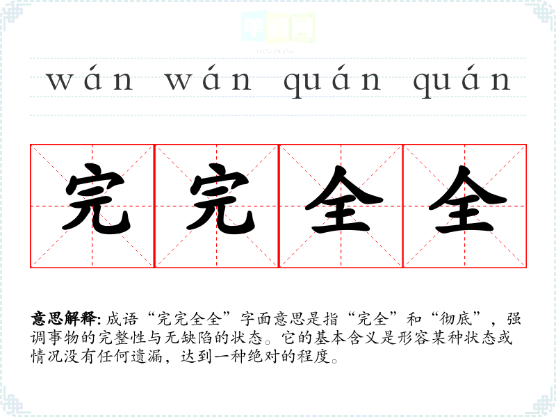 成语“完完全全”字面意思是指“完全”和“彻底”,强调事物的完整性与无缺陷的状态。它的基本含义是形容某种状态或情况没有任何遗漏,达到一种绝对的程度。