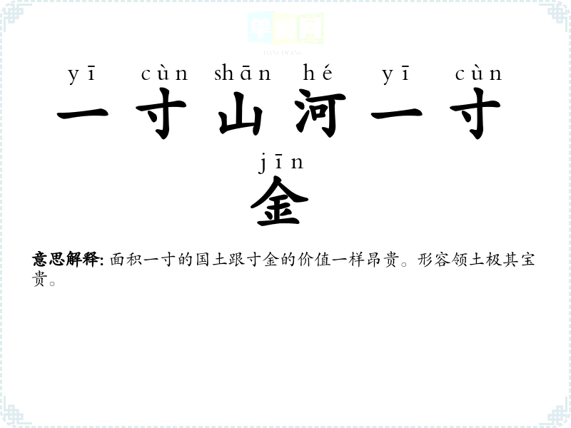 | 一寸山河一寸金 | 面积一寸的国土跟寸金的价值一样昂贵。形容领土极其宝贵。 |