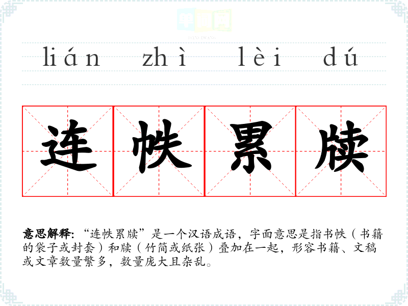 “连帙累牍”是一个汉语成语,字面意思是指书帙(书籍的袋子或封套)和牍(竹简或纸张)叠加在一起,形容书籍、文稿或文章数量繁多,数量庞大且杂乱。