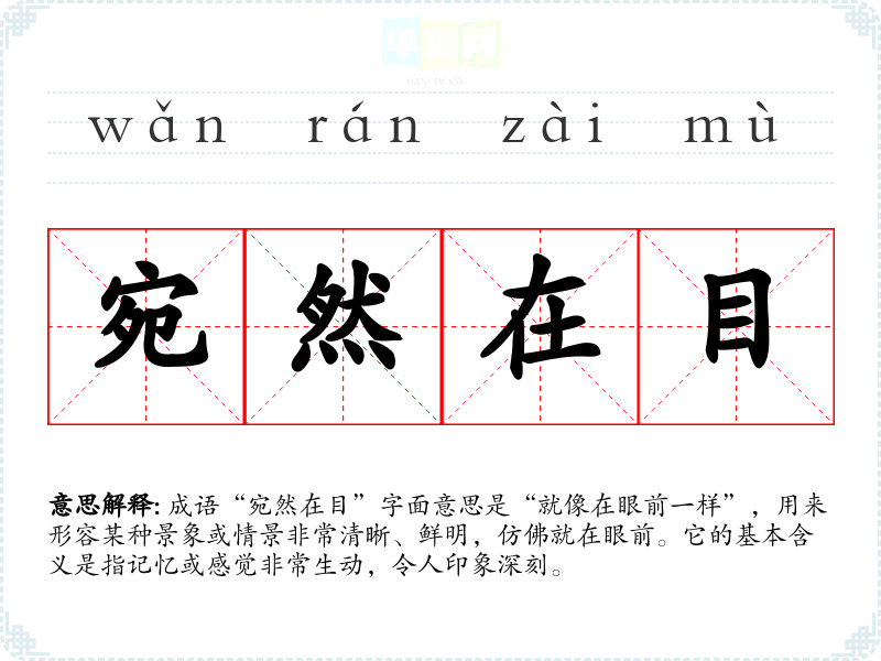 成语“宛然在目”字面意思是“就像在眼前一样”,用来形容某种景象或情景非常清晰、鲜明,仿佛就在眼前。它的基本含义是指记忆或感觉非常生动,令人印象深刻。