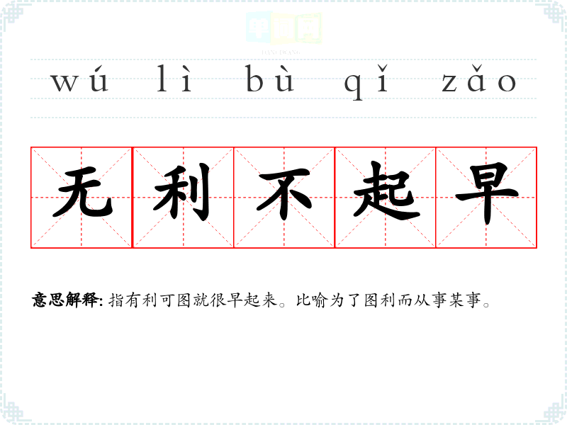 | 无利不起早 | 指有利可图就很早起来。比喻为了图利而从事某事。 |